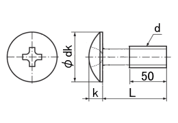 RoHS対応頭部外径がナベ頭と比べて大きく締め付ける相手材との接地面を大きくとることが出来ますので座面の陥没を防ぐことが出来ます。また頭部の縁が薄いため見栄えが良く、外観部品としても使用されています。ねじ部は50mmとなります。