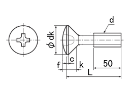 頭部は、皿頭の上部が丸くなった形状。ロゼットワッシャ-と組合せて、化粧ねじとして使われる場合もあります。ねじ部は50mmとなります。
