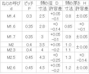ねじの呼びd M1.4長さL(mm) 12入数 2000販売価格 (税別) ¥8,4001個あたり(税別) ¥4.2