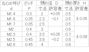 ねじの呼びd M1.4長さL(mm) 10入数 2000販売価格 (税別) ¥7,8001個あたり(税別) ¥3.9