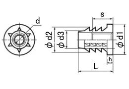 木工用、打込み式のインサートナットです。部品強度が弱く、雌ネジを作れない部分に挿入して使用します。Aタイプの頭部にツバを付けたタイプとなります。平座金の機能を備えたツバ付の為、軟材及び部材を挟んで締め付ける場合や手の入らない裏側等への使用に適してます。