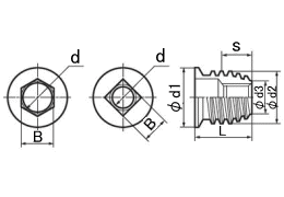 木工用、ねじ込み式のツバ付きタイプのインサートナットです。部品強度が弱く、雌ネジを作れない部分に挿入して使用します。外周のテーパねじにより挿入抵抗が少なく割れを防ぎ無理なく真直ぐねじ込めます。六角レンチ使用の為、自動挿入機を使ってもナットの共回り、抜けが防げます。