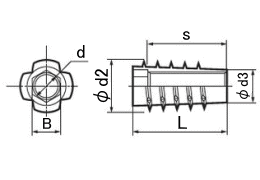 木工用、ねじ込み式、Dタイプのツバ無しタイプのインサートナットです。部品強度が弱く、雌ネジを作れない部分に挿入して使用します。独自のテーパねじにより部材の割れやカタヨリ挿入を防ぎ、引張強度、締付トルクが更に強力になりました。ねじサイズはM4~M8まで、長さのバリエーションも豊富です。