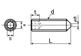 頭部が無く、全ねじの形状となってます。六角穴があいていて六角レンチで締め付けします。主に軸となるシャフト等を固定したり、調整等に使用されています。ねじ部先端は尖っていて相手材にはその先端で接触する形となります。剣先とも呼ばれています。JISでの正式名は六角穴付き止めねじになりますが六角穴付きボルトと混同してしまいやすい為、ホーローセット、ホーローなどと呼ばれる場合も多いです。表面処理は鉄の場合、焼入れ、黒染め処理となりますが、こちらの商品は黒染めが一般的であることから生地と表記しています。