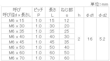 ねじの呼びd M6長さL(mm) 60入数 1販売価格 (税別) ¥2001個あたり(税別) ¥200