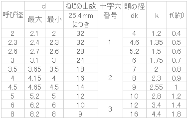 ねじの呼びd 2.6長さL(mm) 25入数 1000販売価格 (税別) ¥4,9001個あたり(税別) ¥4.9