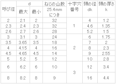 ねじの呼びd 2.6長さL(mm) 25入数 1000販売価格 (税別) ¥5,6001個あたり(税別) ¥5.6