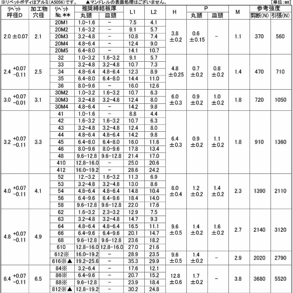■材質:リベットボディ アルミ(A5154又はA5056)、マンドレル スチール