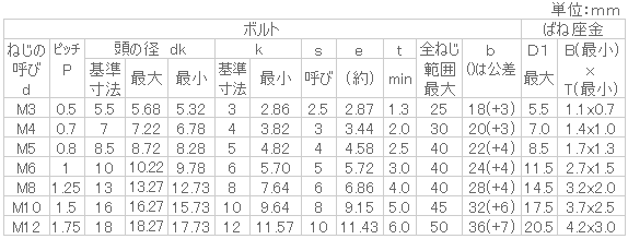 ■規格:JIS B1176 六角穴付きボルト・強度区分10.9にJIS B1251 ばね座金に規定する一般用と断面の形状寸法が同じで内外径が異なるばね座金を組み込んだものです。